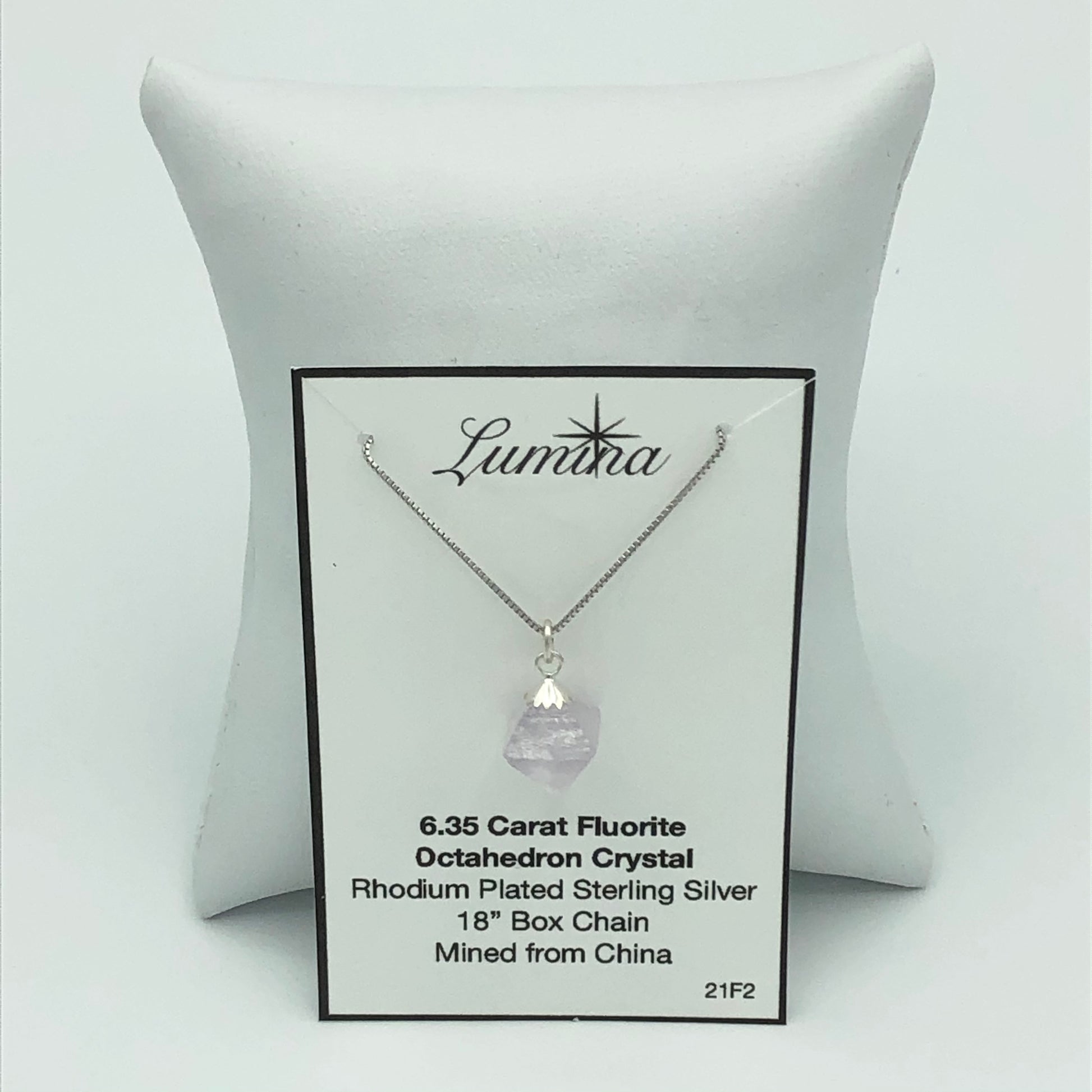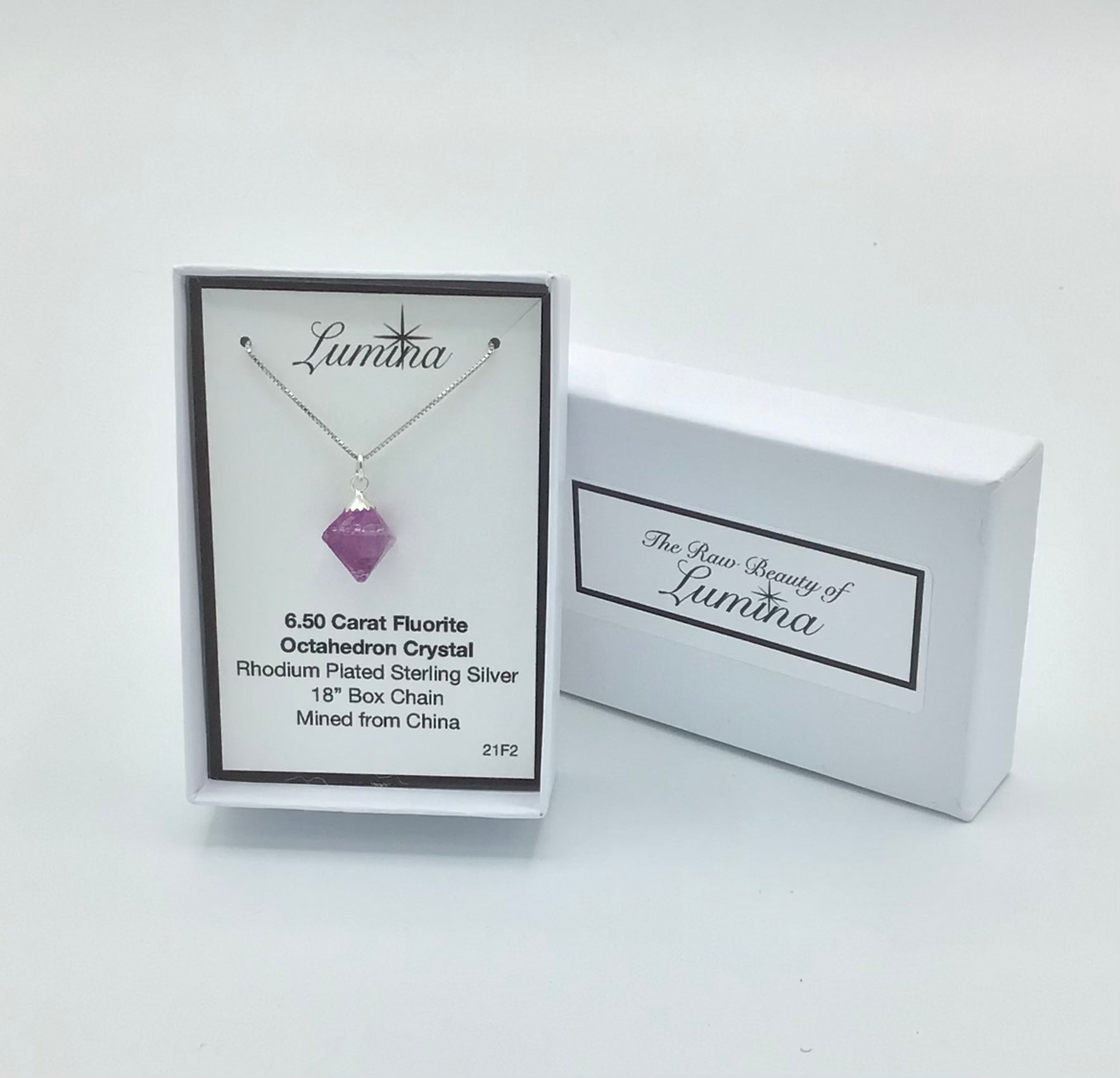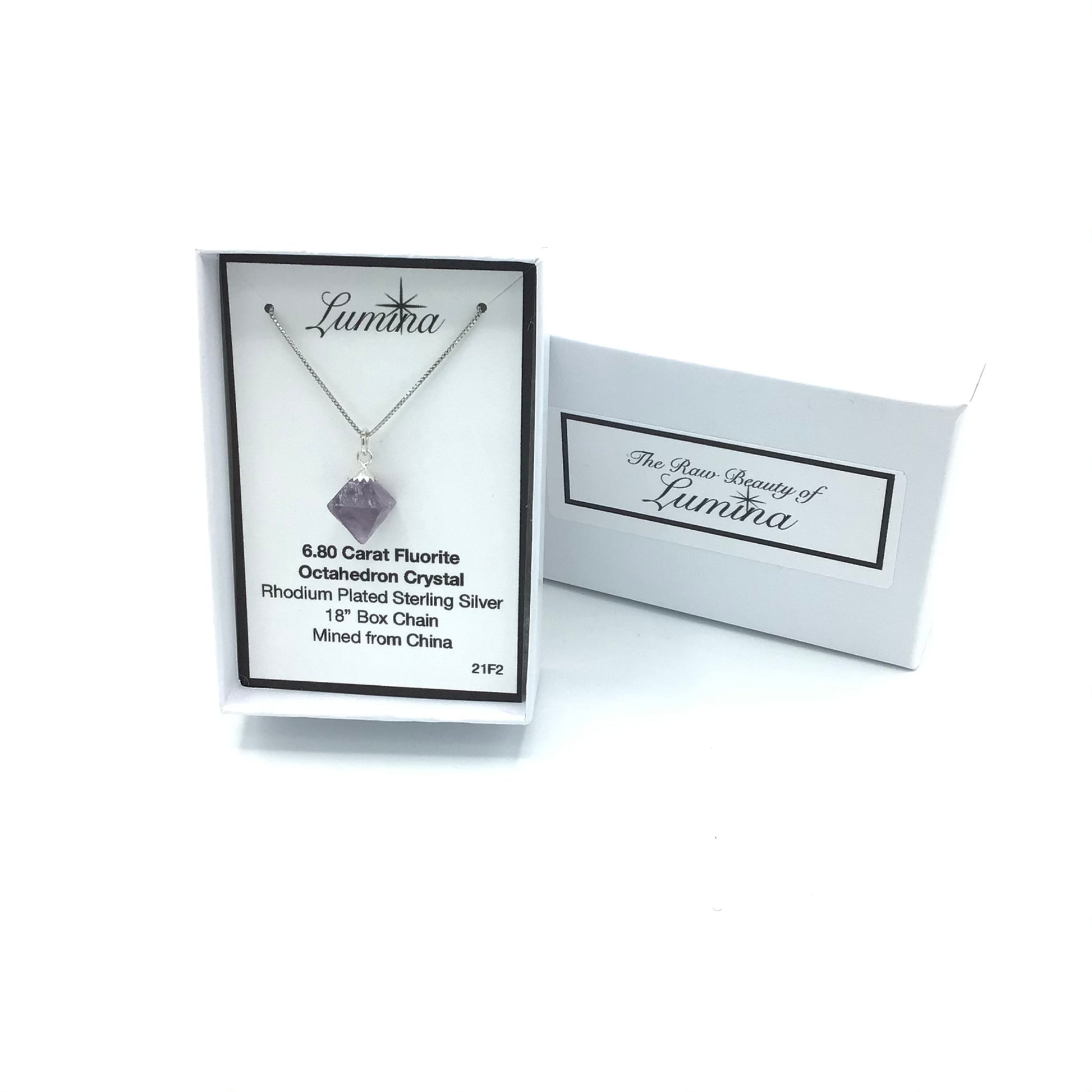 Lumina's gem stones are hand picked by Lumina. Then after our rock hounding picking adventure the finds are brought back to Lumina's Lab where they are cleaned, sorted, weighed, and classified. The mineral is then created using Sterling Silver cap/top with a Rhodium Plated Sterling Silver Box Chain. The perfect Specimen is then chosen. Fluorites are designed showcasing it's raw, straight from the earth beauty.