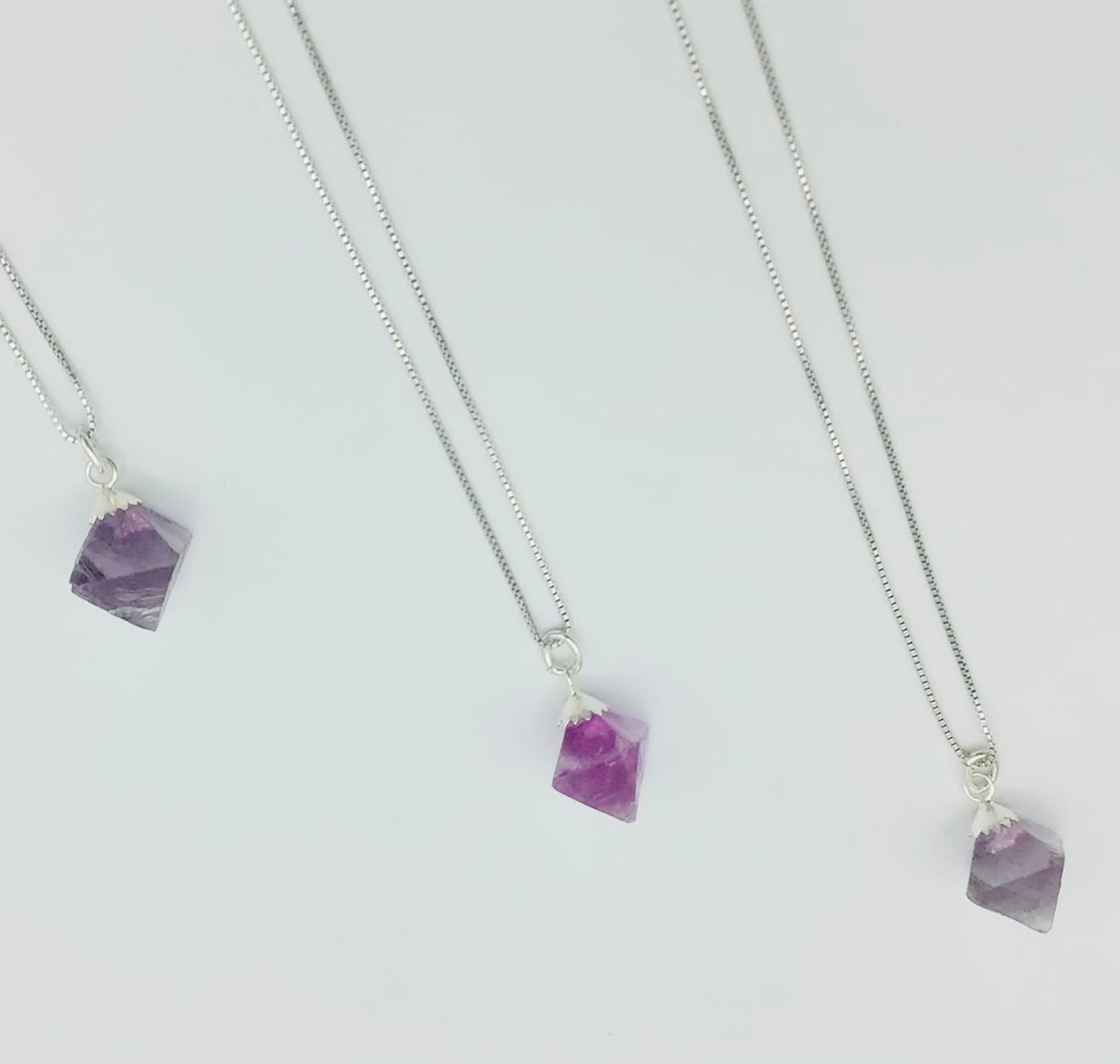 Fluorites are Sterling Silver Capped on an 18”Rhodium Plated Sterling Silver Box Chain